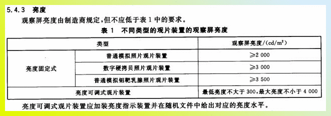 YY/T0610-2007中5.4.3亮度普通模擬照片觀片裝置亮度應大于等于2000cd/m2;數(shù)字硬拷貝照片觀片裝置亮度應大于等于3000cd/m2;普通模擬鉬靶乳腺照片觀片裝置亮度應大于等于3500cd/m2;亮度可調(diào)式觀片裝置最大亮度不小于4000cd/m2。