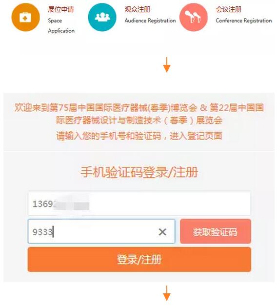 登錄CMEF官網(wǎng) -- 點擊觀眾注冊 -- 輸入手機(jī)號及手機(jī)驗證碼 -- 填寫個人基本信息即完成網(wǎng)上預(yù)登記 (您也可直接點擊閱讀原文進(jìn)行手機(jī)端“觀眾預(yù)登記”)
